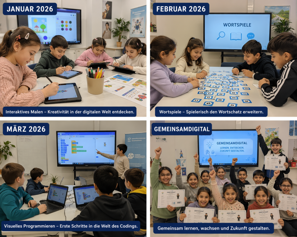 Im Zeitraum von Januar bis März 2026 wurden im Rahmen des Projekts GemeinsamDigital die geplanten Bildungsangebote regelmäßig und strukturiert umgesetzt. Die Sitzungen fanden wöchentlich statt und richteten sich an Kinder im Alter von 6 bis 12 Jahren, die in altersgerechten Gruppen gefördert wurden.